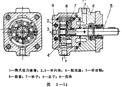 圖5-14為一種雙作葉片馬達的結構圖。它和雙作用葉片泵相比,有以下幾個特點: