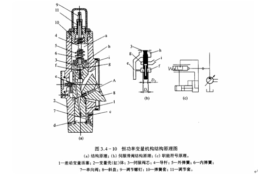 為液壓阪動(伺服)變量機構。又稱壓力補償變量機構,其機構原理如圖3.4-10所示,其中伺服閥芯3與差動變量活塞1掬成伺服滑倒。差動變量活與變量殼(缸)體2掏成主牽動液壓缸。