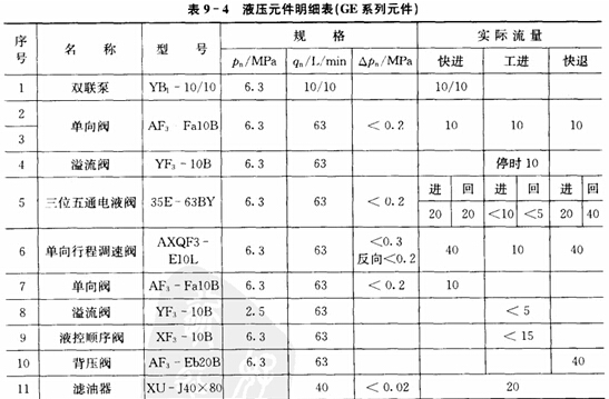 接通過各元件的最大流量選擇液壓元件的規(guī)格,見表9-4。