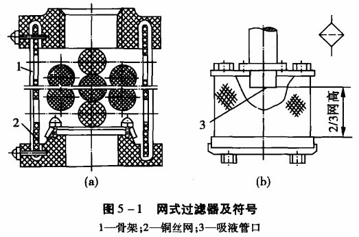 (1)網(wǎng)式過濾器。如圖5 -1所示為網(wǎng)式過濾器,在塑料或金屬筒形骨架1上包著一層或兩層銅絲網(wǎng)2,過濾精度由網(wǎng)孔大小和層數(shù)決定。這種過濾器的特點(diǎn)是:結(jié)構(gòu)簡單,通流能力大,清洗方便,壓力損失小(一般小于0.025 MPa),缺點(diǎn)是過濾精度低(一般過濾精度為0.08 -0.18 mm)。